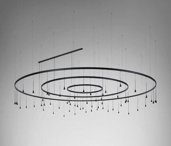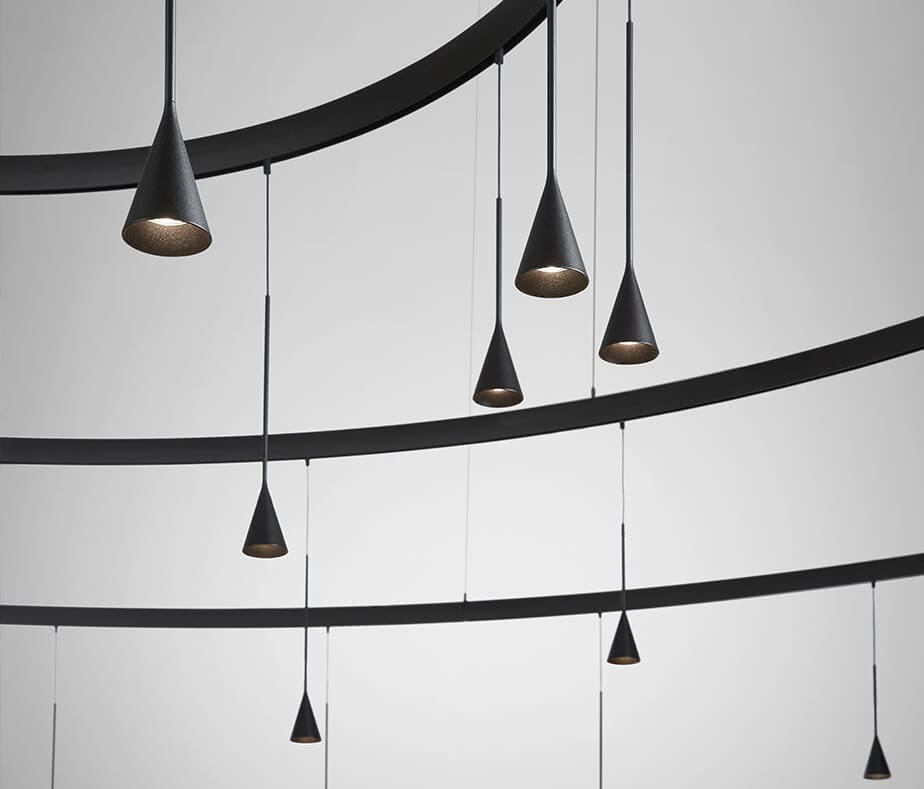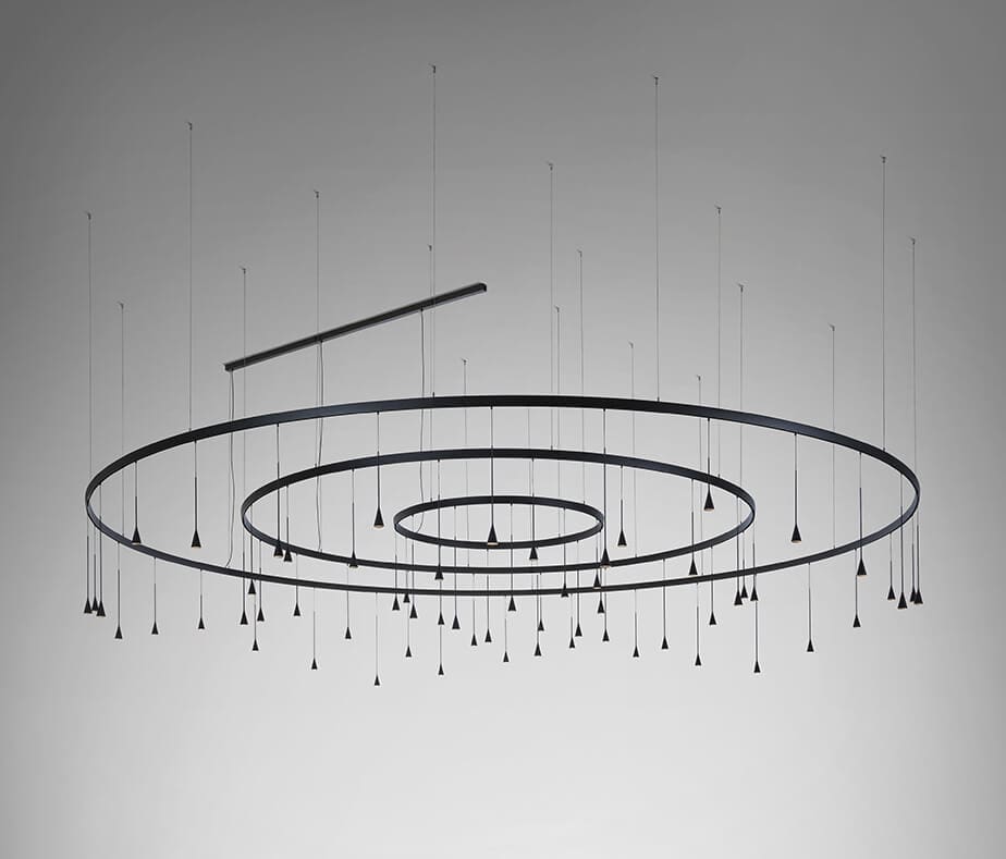 Skybell is an extensive system of light structures, designed to adapt to any type of application. Their main characteristic is the image they give off, they are subtle and cheerful. They breathe a point of fantasy and freedom in their applications because they can be combined in variations, mixing their 4 sizes, until they achieve a more personal and dynamic lamp concept or they can keep all the ‘bells’ in the same length, achieving a more traditional image.