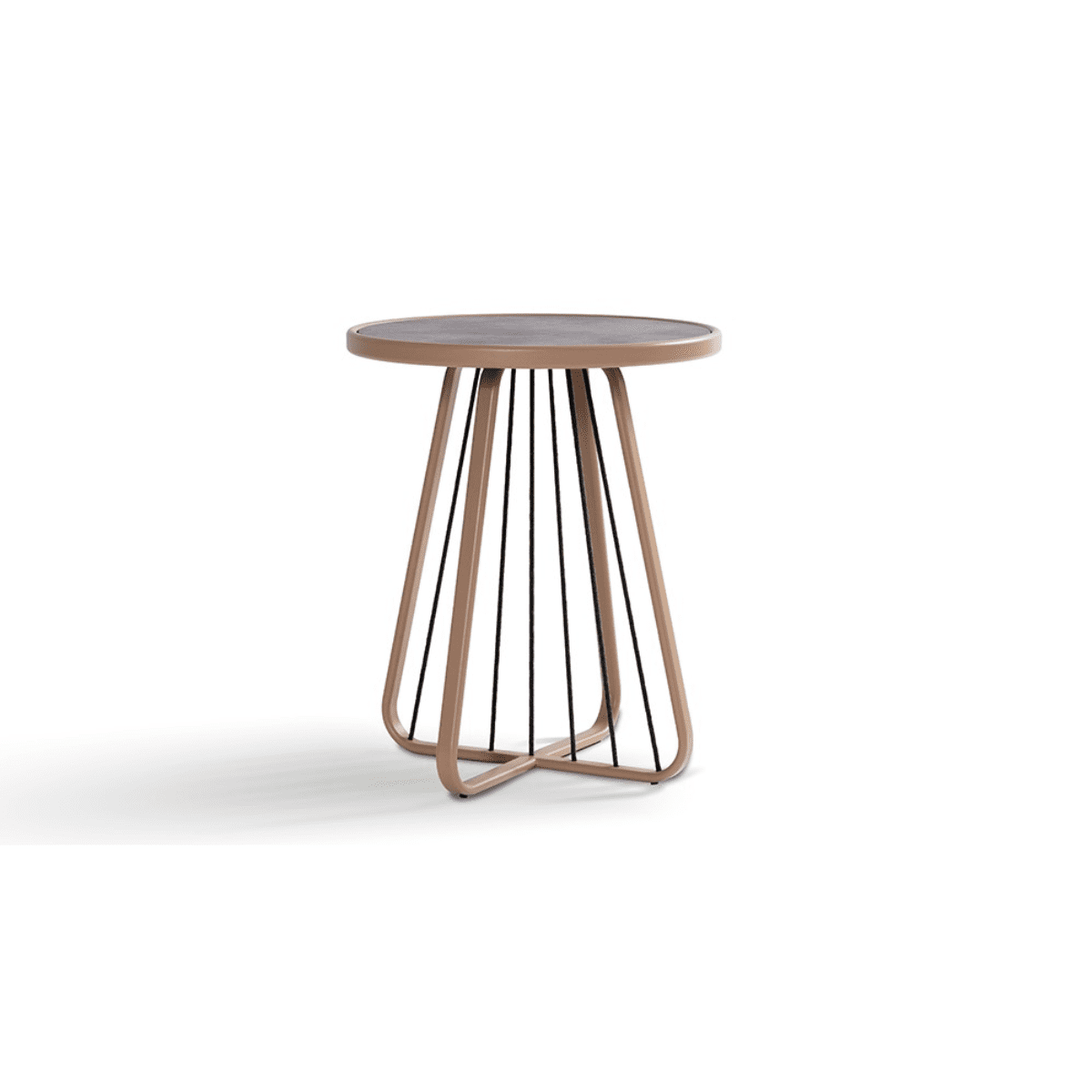 Round low table with structure and border in extruded and painted aluminum profile. Legs with and without tensioned acrylic long rope. Top in HPL laminate available in different finishes. Feet in moulded PVC.