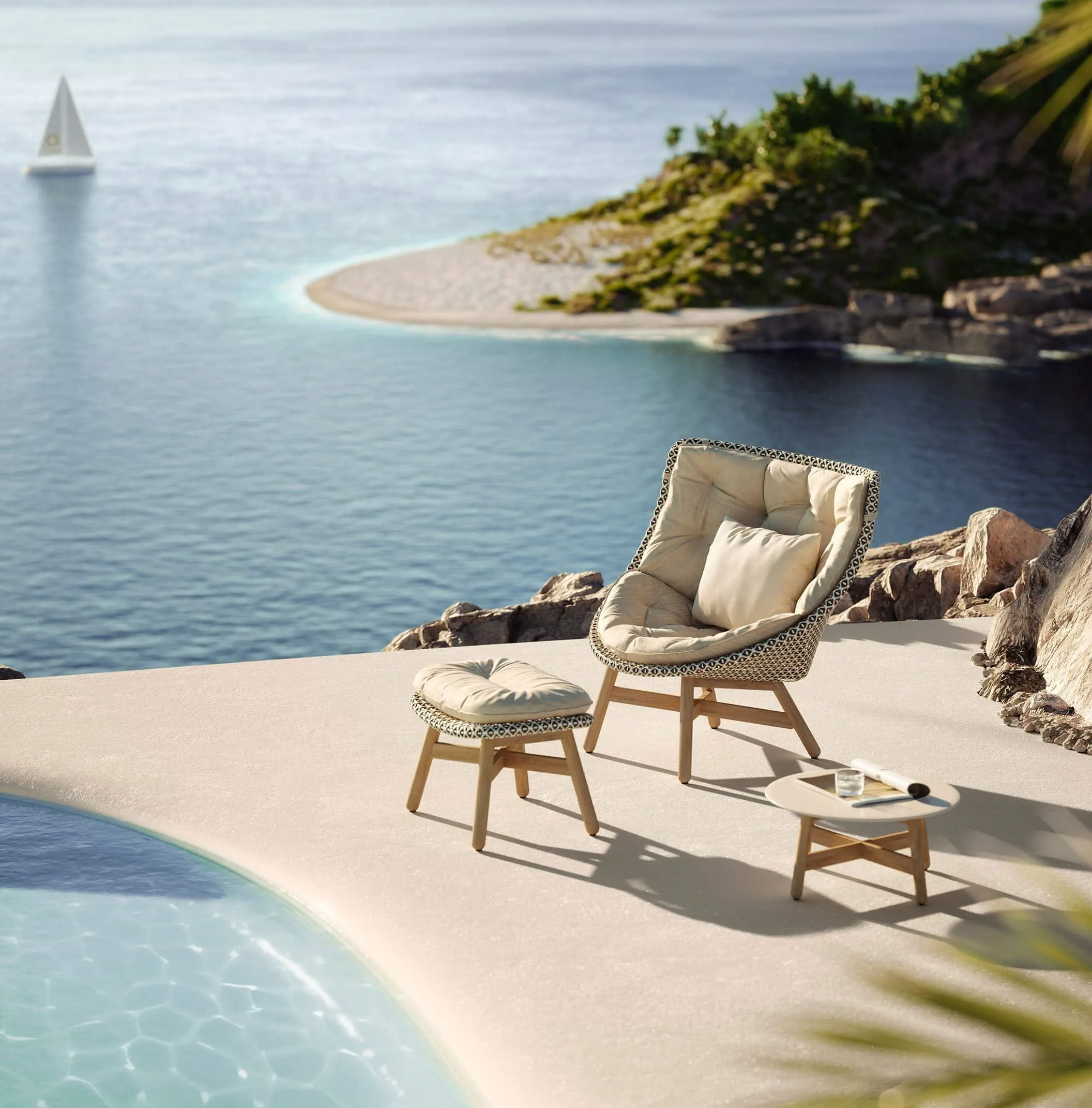 Mbrace by Sebsatian Herkner takes a joyfully unconventional approach to poolside furniture, bringing Dedon fiber seating and a solid teak base together for the very first time. The result is an eye-catching, instantly likeable collection for lounging, dining and more. Mbrace captures the spirit of barefoot luxury while extending the Dedon design language into new, more Nordic territory.