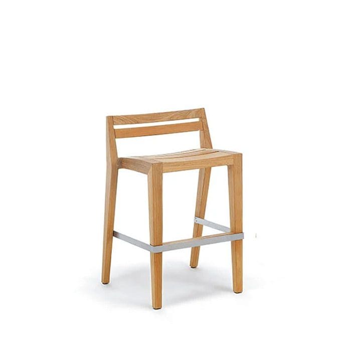 Ribot, the collection made entirely from solid teak, featuring dining chairs, lounge armchairs, footstools, coffee table and extendable table, now stars a tall stool with backrest. The new stool, comes in two heights, has the same solid, formal composition of the other furnishings in the collection and the same sensations of ‘warmth’ and familiarity. Solidity and clean lines, modern minimalism and great functionality are the winning elements that make the Ribot collection the ideal choice for any style of outdoor setting.