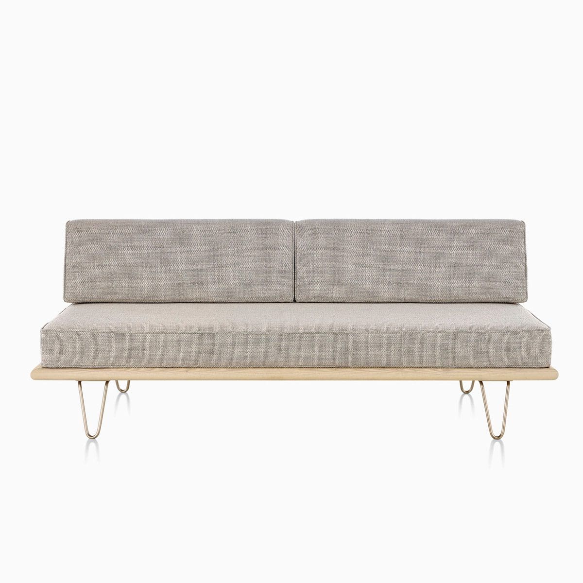 Originally designed in 1950 by George Nelson, its reissue retains original specifications and crafted details like the beveled edges of the wood platform and rounded welt-cord piping of the cushions, a feature that distinguishes the original from imitations. Stainless steel hairpin legs or the tapered wood legs give it the classic Nelson touch. The cushioning is enhanced with dual-density foam for more support and durability while maintaining its lightweight aesthetic. As homes and apartments shrink in size, multipurpose furniture like the Nelson Daybed add a practical and sophisticated presence to any room.