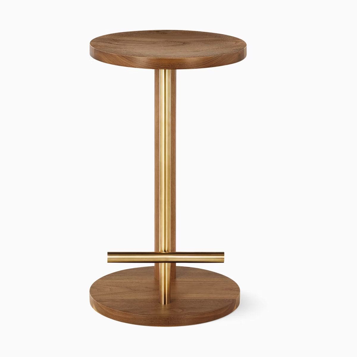 A deconstructed cylindrical shape refined to its bare essentials, the Spot Stool (2016) brings an austere sense of elegance to any interior. Two parallel legs join the circular seat and base together in a kindred pairing of metal and wood. Offered in three heights, with the two tallest outfitted with a crossbar footrest, this modern counter stool was designed by Michael Anastassiades.