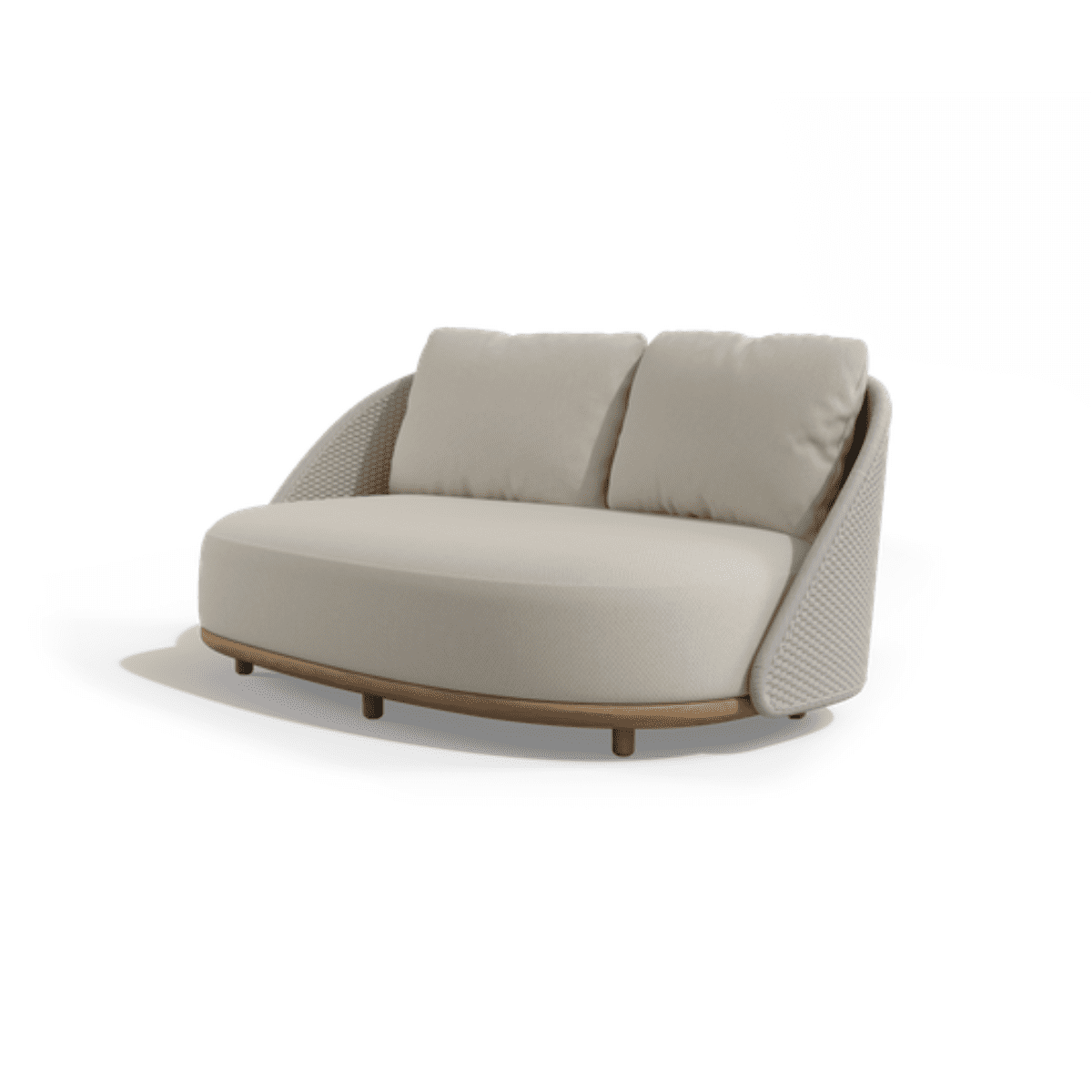 Elio, referring to the Greek sun god Helios and designed by Canadian design firm Yabu Pushelberg, is inspired by the motion of light as it reflects and refracts on landscapes and objects. Multiple soft shades of yarn are woven into one strand, which mimics the hues of natural light and makes each chair unique. The handwoven seat in weather-resistant Tricord rope, draws inward to create a warm, intimate cocoon effect. The 2-seat sofa is framed by natural teak, which supports the seating shell primarily through the back legs that cross the shell.