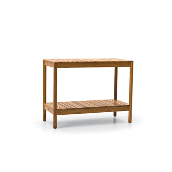 The irregular arrangement of the teak slats, coming from certified plantations, characterizes the Barcode console, the ideal complement to accompany the beds of the homonymous collection.
