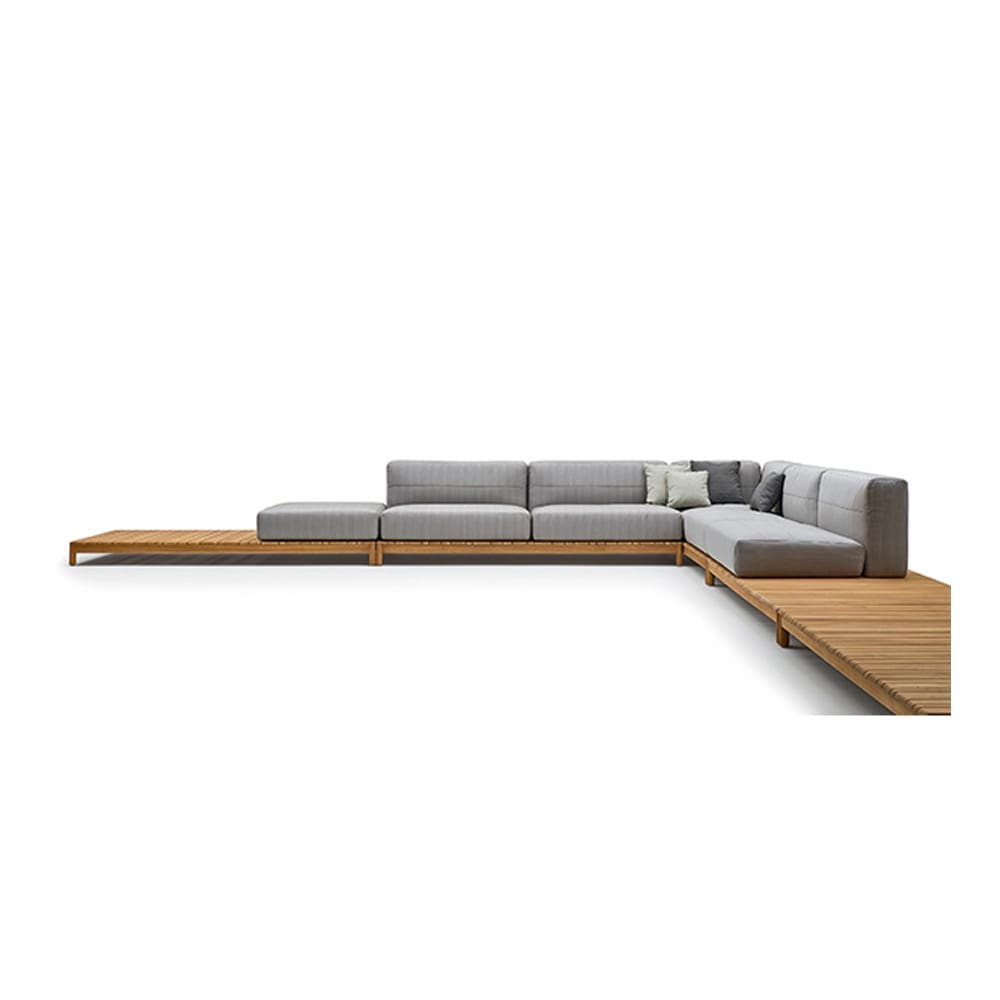 On a supporting structure in solid teak wood, with slats of different sizes, cushions with regular shapes lie, which shape the seat and back of the Barcode sofa. The simple and essential design of the Barcode modules offers ample possibilities for customization: hence the possibility of creating unique compositions, which allow you to enjoy the best of the outdoor space both in the home garden and in the relaxation areas of clubs and spas.